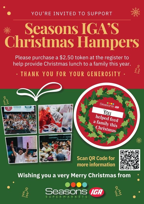 This Christmas, let's come together, share the joy, and make a lasting impact. Purchase your $2.50 token today and be a part of the Seasons IGA Christmas Hamper Appeal. Together, we can ensure that every family has the opportunity to experience the magic of Christmas!